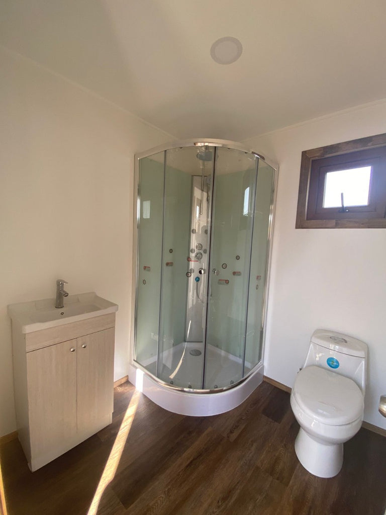 Revestimento interior: OSB e pedra vulcânica lisa. Revestimento exterior: revestimento em fibrocimento. Isolamento de poliuretano projetado no teto. Isolamento de lã de vidro nas paredes. Pavimento vinílico de encaixe.